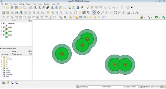 - สร้าง Buffer จากจุดข้อมูลแต่ละจุดโดยสร้าง Buffer 100 เมตร 300 เมตร 500 เมตร